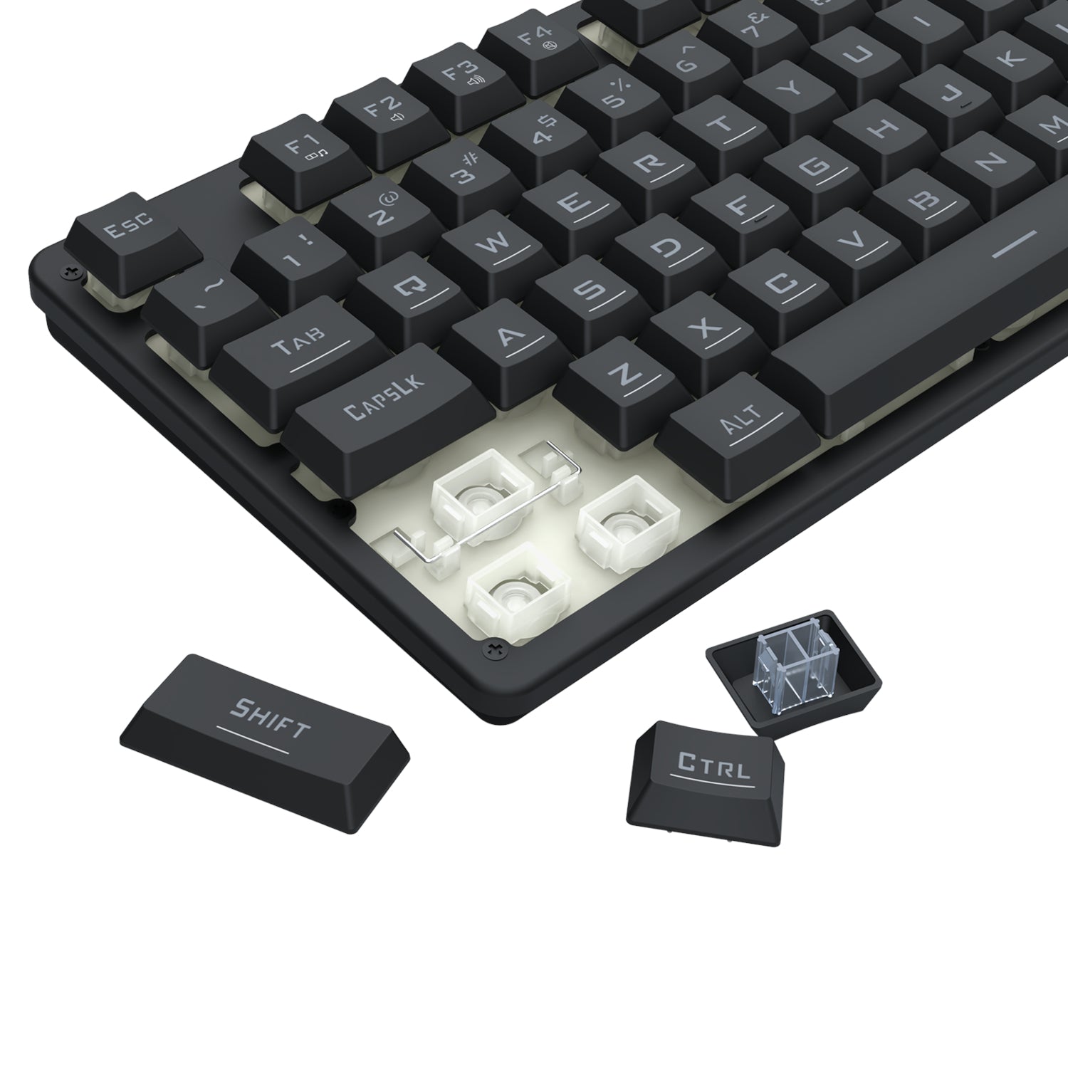 The Redragon S107 RGB Gaming Keyboard features a full-size 104-key layout with smooth, mechanical-feel membrane switches, engineered for both comfort and accuracy. Enjoy tactile keypresses and enhanced multi-key performance with 25-key anti-ghosting, ensuring no missed inputs during fast-paced gameplay. With six vivid RGB lighting modes, including breathing and wave effects, you can customise your battlestation to match your mood or game. Built-in height adjustment and durable laser-engraved keycaps make this keyboard ideal for extended gaming or work sessions, while plug-and-play setup via USB ensures instant compatibility—no drivers needed.