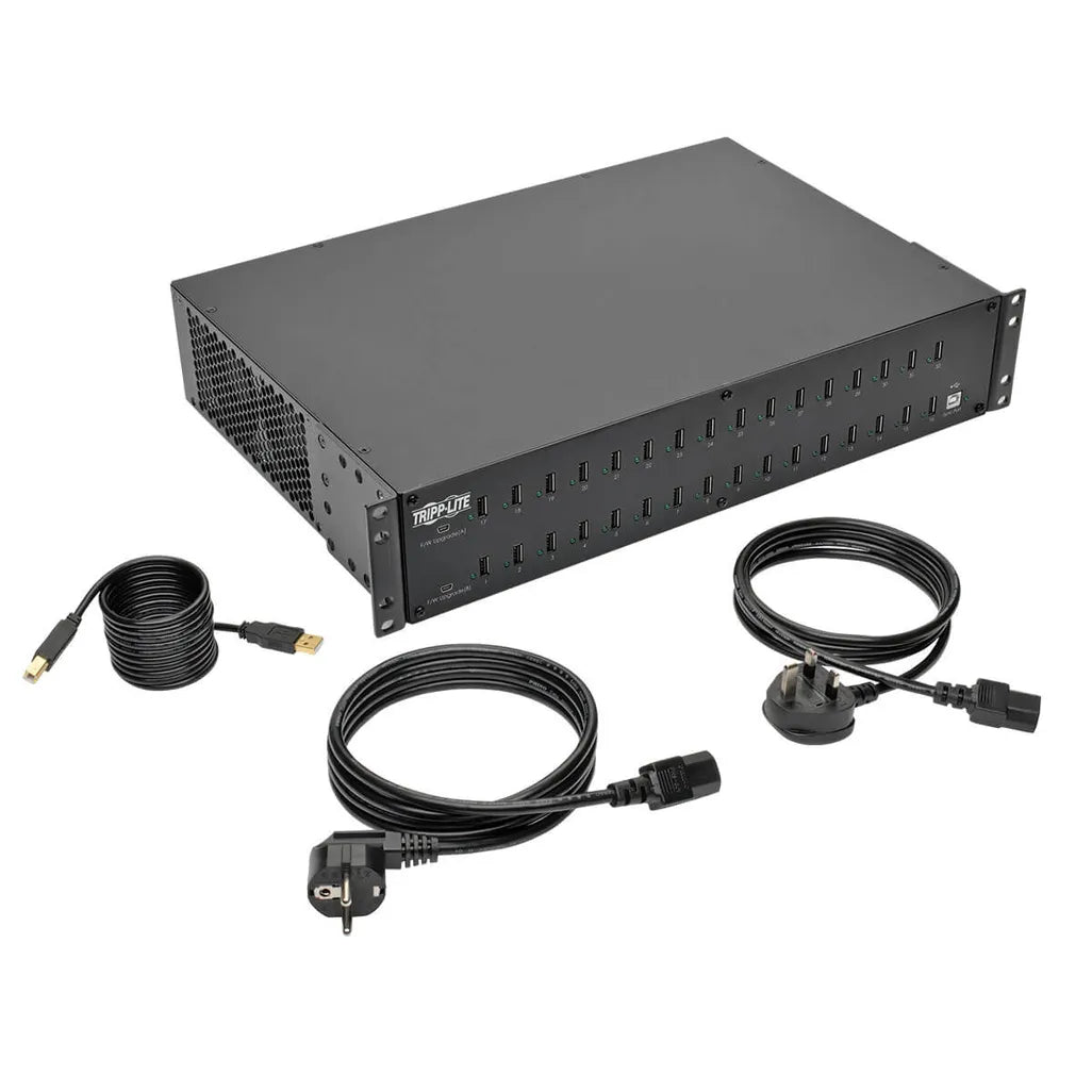 The Eaton 32-Port USB Charging Station with Syncing delivers centralized, high-capacity charging for multiple USB devices from a single 230V source. Designed for 19" rack systems, this 2U rack-mount charger fits into standard infrastructure to streamline device charging in classrooms, labs, clinics, and enterprise settings.