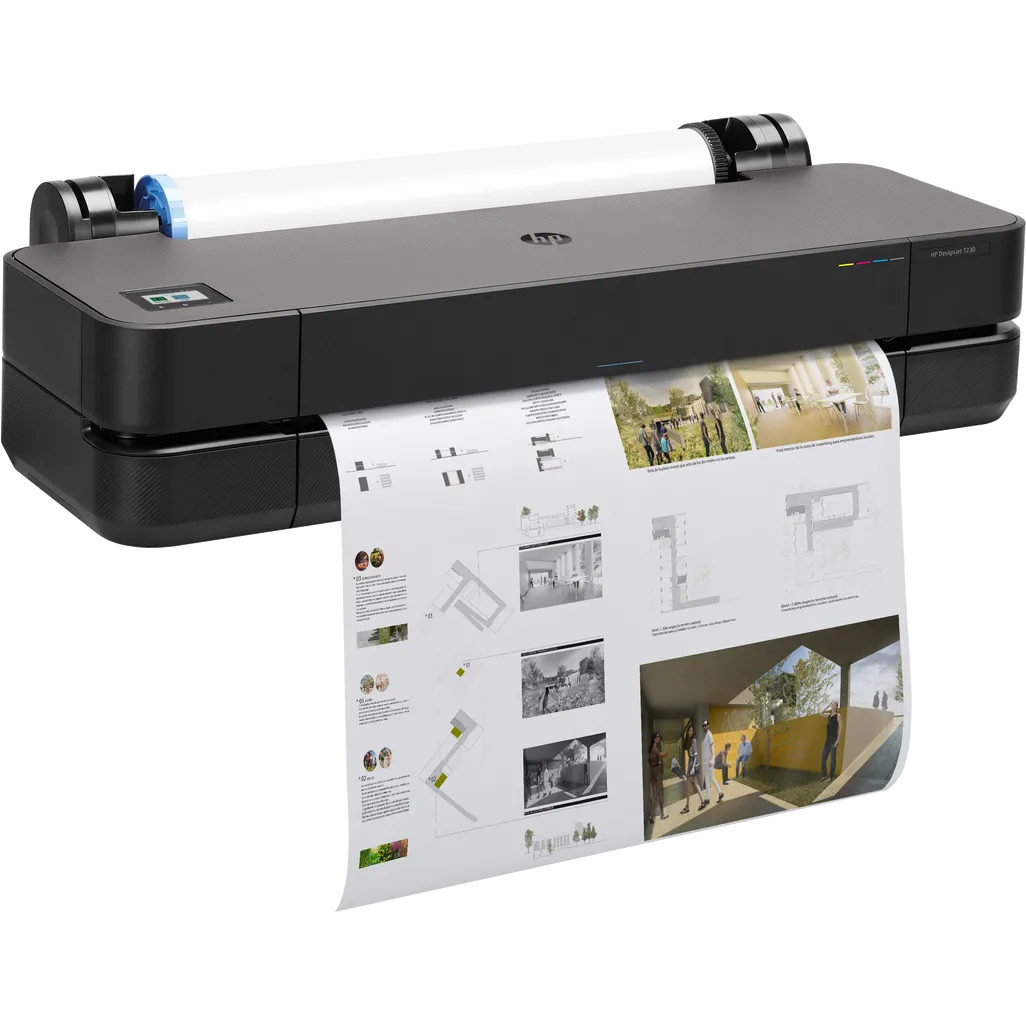 Built for everyday use, the T230 delivers crisp line drawings and vibrant color across a variety of media. It features front‑loading media with convenient roll feed and cut‑sheet capability, making it easy to switch between jobs. Network connectivity and compatible HP driver software provide straightforward setup and color management, helping teams stay productive from drafting to presentation.