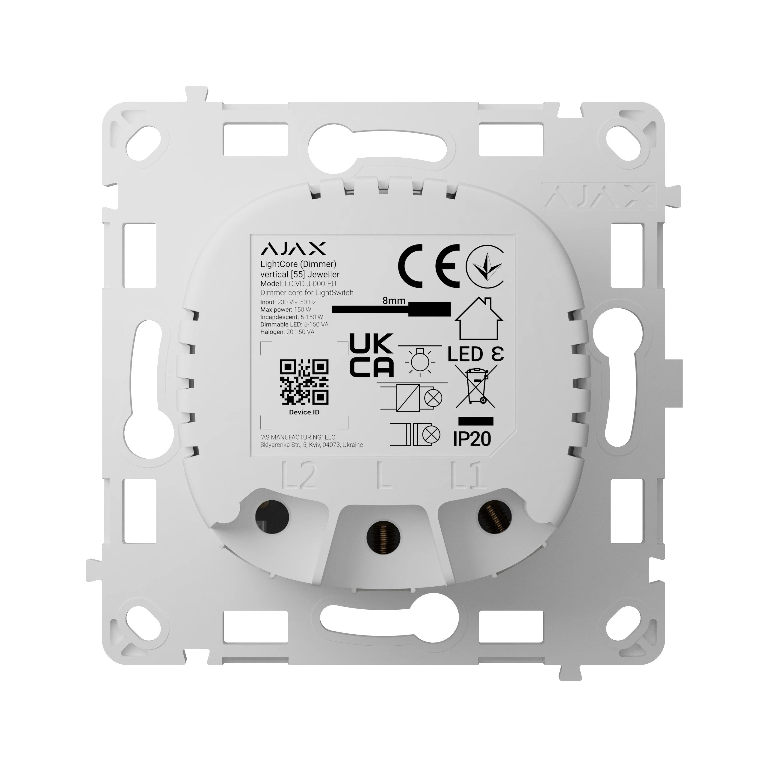 The LightCore Dimmer is designed for simplicity. It fits into a standard European mounting box and connects easily to the power phase wire. Adding the device to your Ajax security system is as simple as scanning a QR code within the app. Please note, this product is the LightCore dimmer module only. A compatible touch-sensitive button (e.g., SoloButton) and Frame are required for operation and are sold separately.