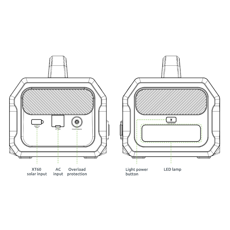 | Multiple input charging options - draw power from your car, solar panel, or from wall sockets | |