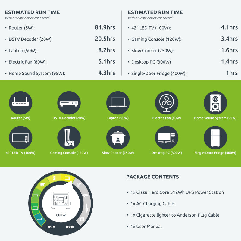 Deliver power wherever and whenever you need it with the portable Gizzu Hero Core UPS Power Station. The Hero Core offers 512Wh of battery capacity. It's great for keeping your devices charged during outdoor adventures and powering most household appliances during loadshedding. The elegant design is durable, robust, and can be taken with you on any adventure.