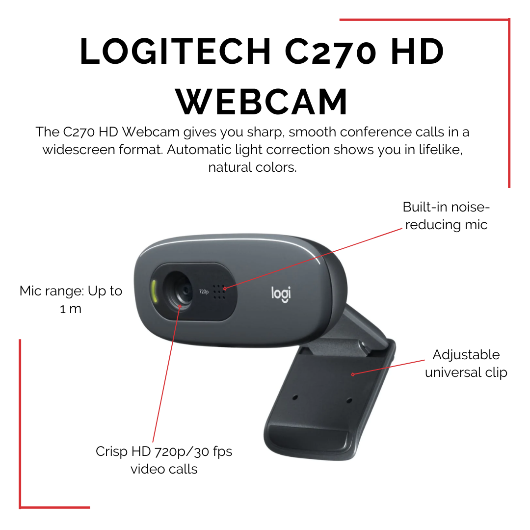 The Logitech C270 HD Webcam offers simple and effective video communication. With HD 720p video calling and a noise-reducing microphone, you'll be seen and heard clearly. It's perfect for online meetings, video chats with family, or creating content.