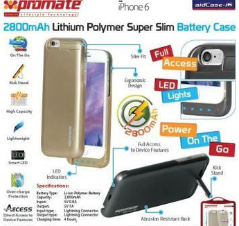 Power up your iPhone 6 without sacrificing style with the Promate aidCase-i6 2800mAh Lithium Polymer. This super slim battery case in a premium Gold finish adds reliable on-the-go power while keeping your device sleek and pocket-friendly. Included in a Retail Box, it comes with a 1 Year Warranty for peace of mind.